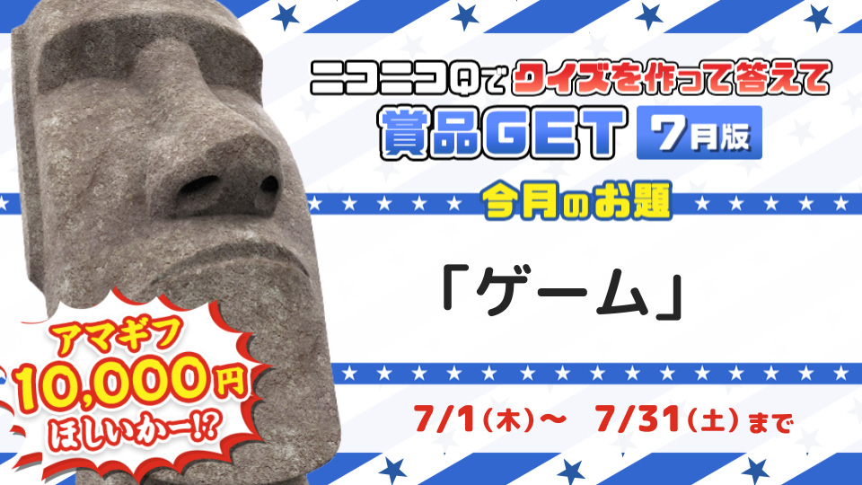 7月1日(木)から7月31日(土)までの期間、クイズの投稿・回答でAmazonギフト券やニコニ広告チケットがもらえる「ニコニコでクイズキャンペーン【7月版】」を開催いたします。